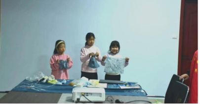 到了实践的环节,志愿者们手把手地教孩子们进行扎染,耐心的示范捆扎手法,并且一一解答小朋友们提出的问题,现场气氛热烈,互动频繁,欢声笑语。